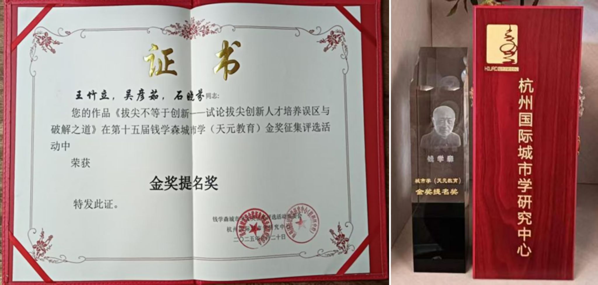 钱学森城市学金奖是由杭州城研中心主办的全国性高端学术奖项,旨在汇聚城市学研究领域的顶尖智慧,本届奖项围绕 “城市土地住房”“城市教育” 等七大主题征集作品,吸引了全国众多高校、科研机构的权威专家参与。王竹立教授团队的获奖成果聚焦拔尖创新人才培养领域的核心问题,深刻剖析了当前人才培养中“将拔尖等同于创新”的认知误区,从理论逻辑、实践困境与破解路径三个维度展开系统研究,提出了兼顾“拔尖特质培育” 与 “创新能力激发”的人才培养新框架,为我国基础学科拔尖人才培养体系优化提供了重要理论参考。